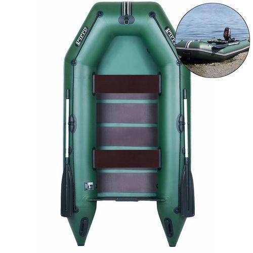 Чудовий двомісний надувний моторний ПВХ-човен, що ідеально підходить до чотирьох осіб. Можна використовувати на різних типах водойм з прісною або морською водою. Універсальний у застосуванні, підходить для риболовлі, полювання, дайвінгу, водного туризму і сімейного відпочинку. Виготовлений надувний човен з дотриманням всіх ГОСТів і стандартів зі спеціальної човнової тканини - п'ятишарового армованого ПВХ виробництва Німеччини, його міцності цілком достатньо, щоб уникнути невеликих проколів і пошкоджень. Конструкція передбачає три герметичні відсіки, ізольовані між собою. Таким чином у разі проколу або порізу одного з них залишиться на плаву.